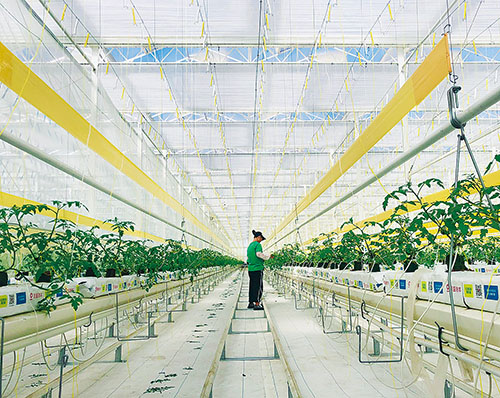 青岛有田农业发展有限公司高标准玻璃温室内,正在通过物联网实时监控系统培育照料种苗。