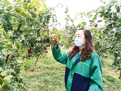 据了解,这片采摘园以前属于荒丘,顶部土层仅有10多公分厚,种粮食不长,却非常适合种植果树。2003年,村民齐术太承包了这片110亩左右的荒丘,除了种植了桃树、樱桃树外,还开辟出35亩建起垛埠岭大枣生态园。“现在适合采摘的是大梨枣,这种枣是专门从陕西杨凌农科院引进的,个头大、皮薄,像梨一样脆、甜,从9月下旬一直可采摘到10月底。”齐术太指着红玛瑙般挂满枝头的大梨枣高兴地说,今年,他果园里的大梨枣正品果亩产量2000余斤,亩收入达到2万余元。