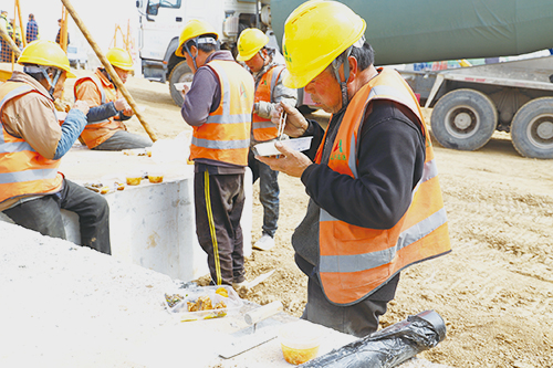 建筑工人们在G308文石线改建工程现场进行墩柱浇筑。