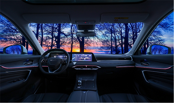 智感座舱方面,新车配备24英寸一体式大联屏和64色极光氛围灯。以简约流畅的设计风格打造的一体式中控台,能给驾乘者带来简约而精致的现代科技感。