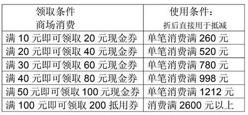 购物双倍送抵用券,消费满50元送100元,满100元送200元(最高送200元),仅此4天12月9-12日,商场当日购物小票领取条件。
