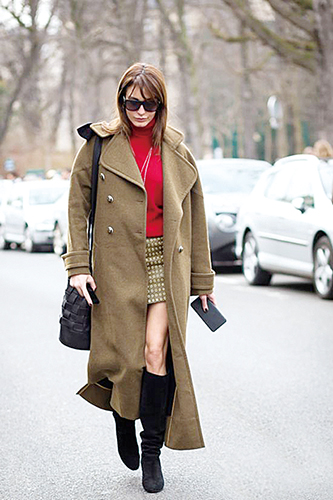 如果你个人不喜欢像草木绿那种明快系的色彩,那么经典又显瘦的军绿色、墨绿和橄榄绿其实一样好看,而且搭配红色也别有一番风情。橄榄绿色的双排扣羊毛大衣,内搭正红色的高领毛衫,穿出别样的气质感,脚上穿黑色高跟长靴也很好地衬托出了上身红与绿之间的“化学反应”。
