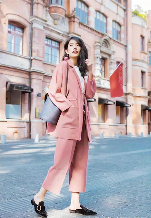 针织搭西装裤普普通通的OL风,有了粉灰玫瑰颜色的加入,也变的优雅高级。