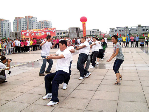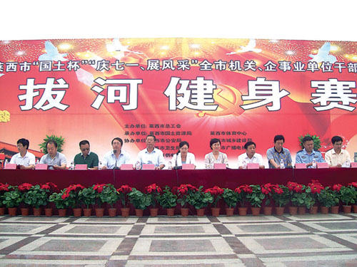 6月30日,由市总工会主办的“国土杯”“庆七一、展风采”全市机关、企事业单位干部职工拔河健身赛在人民广场举行。市领导姜水清、赵燕、李信斋、柳杰及主办、协办单位领导出席活动开幕式。