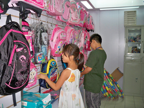 随着中小学校即将开学,许多家长也在为孩子准备新学期的学习用品,各大型商场、超市都专门设立了“开学装备”专区,书包、文具盒、笔、本子,款式新颖、设计独特,美羊羊、白雪公主图案的新书包让不少女孩子爱不释手,前来购买学习用品的学生和家长络绎不绝,都在为新学期准备着。图为孩子们在商场挑选文具。 (姜晓梅)