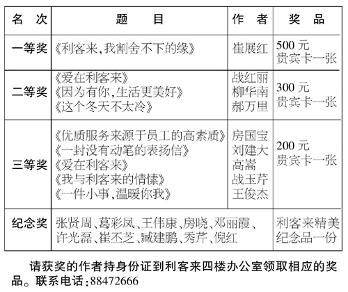 “爱在利客来”有奖征文自开展以来,得到了社会各界的广泛关注与积极参与,共征稿116篇,参赛作品来自各行各业,有政府机关单位、企事业单位、普通职员、退休老人等,更有单位(如自来水公司政工科)组织大批员工踊跃投稿,在此,我们表示最衷心的感谢!