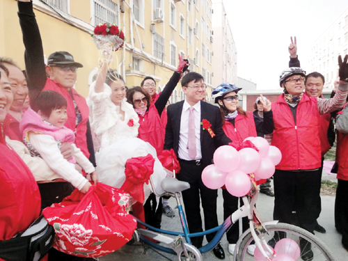 迎娶新娘的婚车,不是气派的加长林肯,也不是张扬的奔驰宝马,但却更吸引人的眼球。11月11日,记者在烟台路上看到,新人刘先生别出心裁,由30多名车友组成的自行车队装扮一新,当起婚车,喜气洋洋地跑在马路上,引来沿途路人羡慕的眼光。 (葛虹虹)