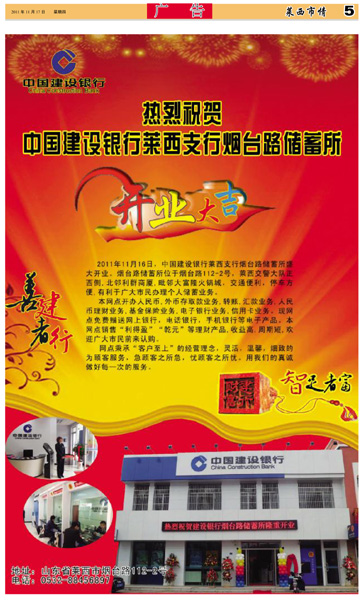 11月16日,中国建设银行莱西支行烟台路储蓄所隆重开业,建设银...