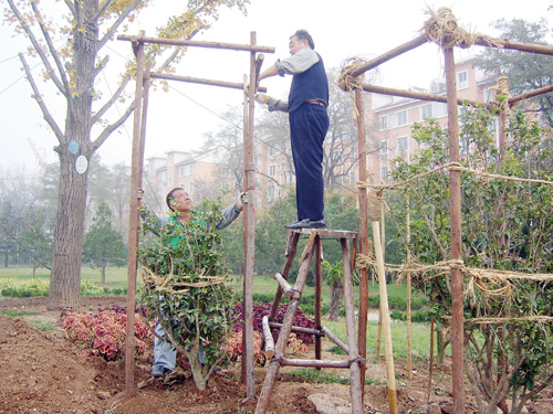 随着气温不断下降,花草树木进入冬季养护阶段。日前,市园林部门着手对城区树木进行全面的冬季防寒养护工作。 市园林部门在统一对市区行道树树干进行涂白的基础上,采取有效的抗寒保暖措施,做好绿地内新栽大树越冬防寒工作。组织绿化人员对大树用草绳、塑料薄膜将树干及大枝缠绕包裹保暖;对露地栽植的桂花、耐冬等名贵花木均搭设防风障。同时,为防止严寒和明年的春旱,对市区行道树和绿地普遍进行了冬灌。 (封学德)?