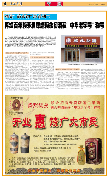 百年历史,经典传承。作为历经两代人历练后的“赖永初”酒到底是怎么酿造出来的?它又有哪些特点深受大众的喜爱?作为“中华老字号”的赖永初酒又是怎样走进山东、走进青岛的?请关注明天的探访“赖永初”酒系列报道。