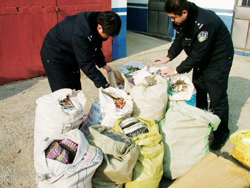 12月17日11时许,市公安局院上派出所民警在对辖区以前有过非法私制烟花爆竹历史的某村进行巡逻检查时发现,有一名正在街头与村民拉呱的中年妇女在见到民警后,立即转身离开,并加快脚步向一户房屋走去,进了屋门后迅速欲将大门关上。见情况可疑,民警遂紧跟一步,该妇女见民警已到其家门口,便推着大门不让民警进入检查,在民警的劝说下,其极不情愿的将门打开。进门后,民警发现原来该妇女的院子里正晾晒着一些已经装好药的土鞭,院子的猪舍上、手扶拖拉机上、围墙上到处是鞭炮,在该妇女家的炕上民警又查获了正在加工的鞭炮和制鞭工具。