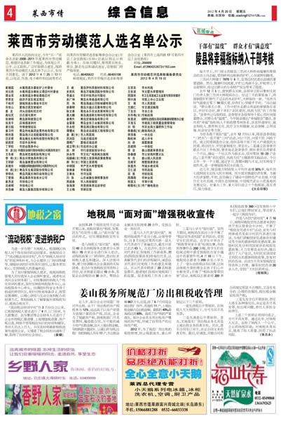 莱西市人民政府决定,今年“五一”前命名表彰2009-2011年度莱西市劳动模范。根据评选表彰工作规定,为体现公开、公平、公正原则,广泛听取群众意见,现将莱西市劳动模范人选名单予以公示。如有不同意见,请于2012年4月25日17时前,以电话、传真、电子邮件和信函等形式向莱西市劳模评选表彰筹委会办公室(市总工会宣教部)反映(信函以到达日邮戳为准)。反映问题时,要用真实姓名、单位、联系电话和通讯地址,受理部门将严格保密。