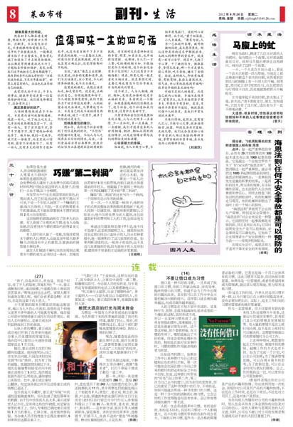 点评:每一起严重事故的背后,必然有29次轻微事故和300起未遂先兆以及1000起事故隐患。它是提出一个在航空界有个关于飞行安全的“海恩法则”。要想消除这一起严重事故,就必须把这1000多起事故隐患控制住。海恩法则强调两点:一是事故的发生是量的积累的结果;二是再好的技术,再完美的规章,在实际操作层面,也无法取代人自身的素质和责任心。同样去检查飞机发动机的涡轮扇叶,有的机械师走马观花,有的机械师却看出了扇叶上的一个细小的裂纹。