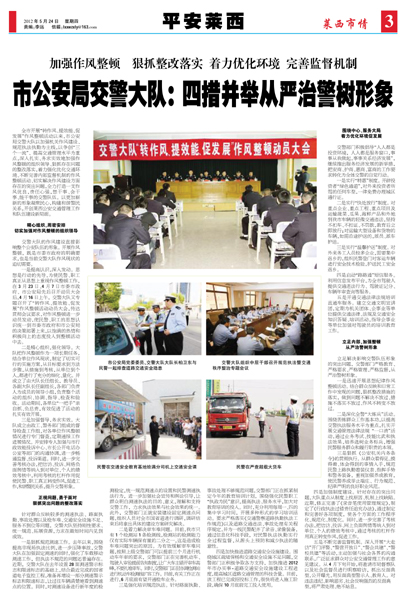 全市开展“转作风、提效能、促发展”作风整顿活动以来,市公安局交警大队以加强机关作风建设、规范执法执勤为主线,以争创“三个一流”、提高交通管理水平为重点,深入扎实、务求实效地加强作风整顿的组织领导、狠抓存在问题的整改落实,着力强化优化交通环境、不断完善内部监督机制的作风整顿活动、切实解决作风建设方面存在的突出问题,全力打造一支作风优良,责任心强,想干事、会干事、能干事的交警队伍。以更加崭新的形象凝聚民心,构建和谐警民关系,开创莱西公安交通管理工作和队伍建设新局面。