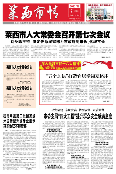 2012年12月6日莱西市第十七届人大常委会第七次会议决定,于永志同志挂职担任莱西市人民政府副市...