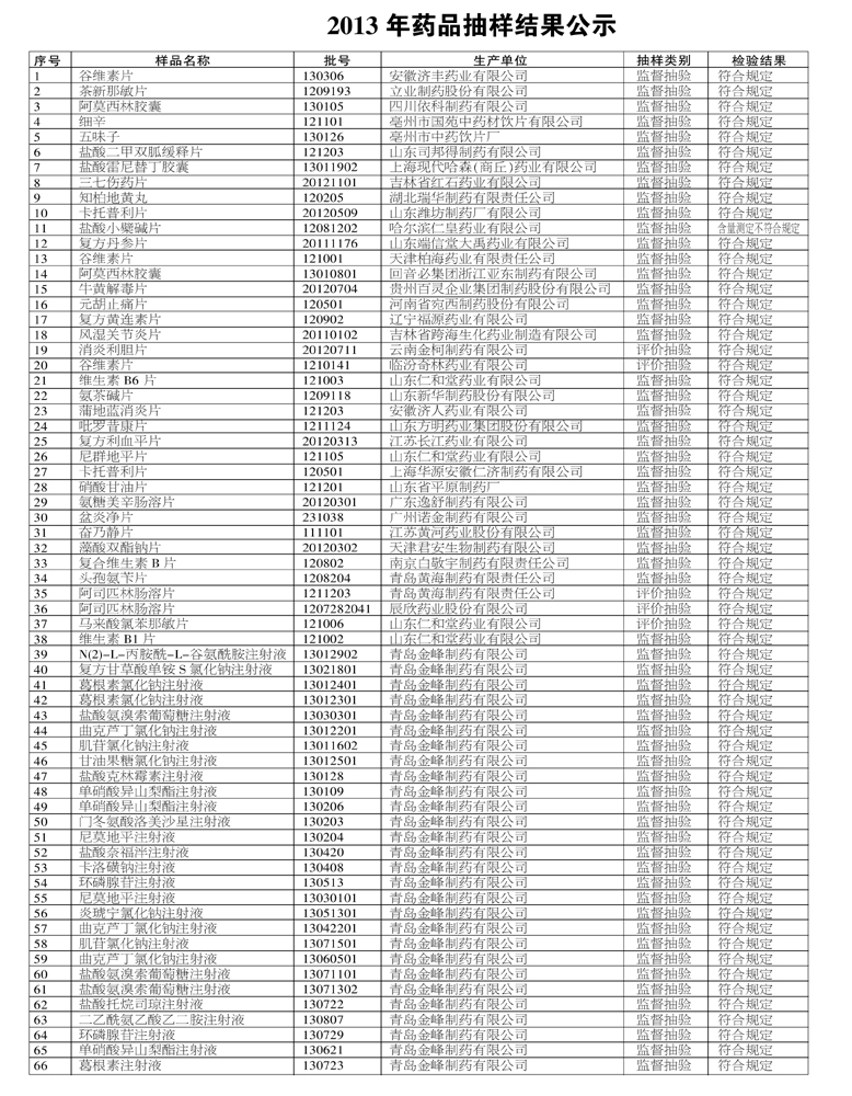 2013年上半年,全市共完成药品抽样91批次,已经收到青岛市药品检验所检验报告66批次,不合格1批次,不合格率1.52%。其中:完成国家药品评价性抽样计划5批次,全部合格,合格率100%;药品生产企业抽样28批次,全部合格;医疗机构抽样8批次,全部合格;药品经营企业抽样30批次,不合格1批次。