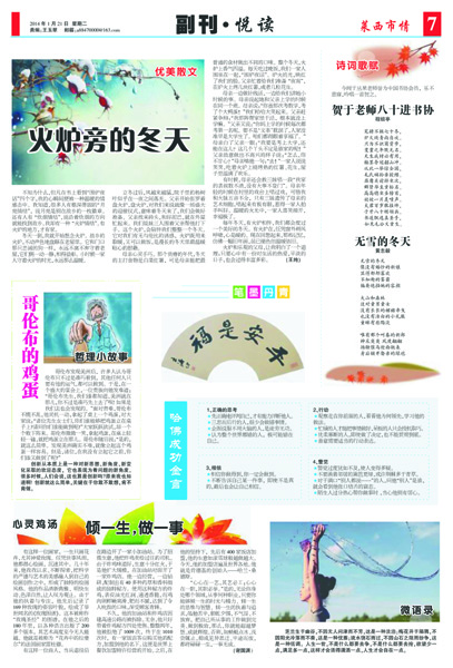 火炉和乐观的父母,让我明白了一个道理:只要心中有一份对生活的热爱,平淡的日子,也会过得丰富多彩。 (王纯)