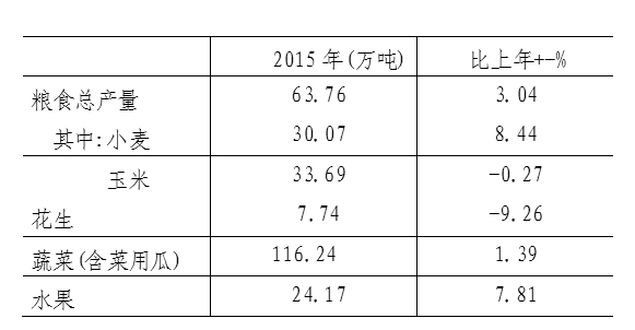 全市种植业增加值完成39.61亿元,比上年增长12.4%。粮食播种面积143.23万亩,比上年增长0.92%;总产量达到63.76万吨,比上年增长3.04%;亩产达到445公斤。花生总产量达到7.74万吨,比上年下降9.26%;亩产达到294公斤。