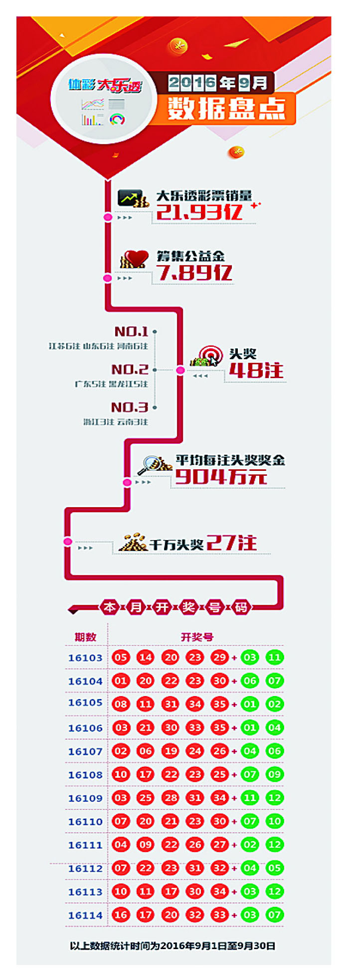 据统计,9月份,体彩大乐透共开奖12期(第16103期至16114期),累计销售21.93亿元,为社会筹集公益金约7.89亿元。头奖共开出48注。