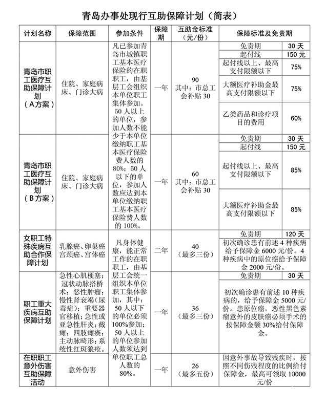 为惠及全市职工,青岛市总工会投入3000万元推行《青岛职工医疗互助保障计划》A、B方案,本计划的主要特点:①统筹范围内个人负担部分按75%给予保障金;②对基本医疗保险乙类药品和诊疗项目费用的个人负担部分按60%的标准给予保障;③对青岛城镇大病医疗救助制度规定的特药救助、特材救助,在政府救助之后,其个人负担部分按60%标准给予保障。