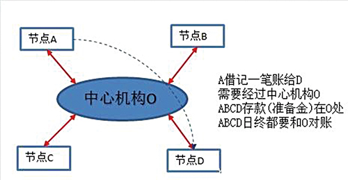 在图1存在一个中心机构O,所有的节点要参与交易必须通过中心机构O来达成交易。这里的中心机构O扮演了两个身份,一个是维护者的身份,即维护交易账目且正常达成交且真实可靠的,另外一个是特权参与者身份,即发行货币的权利。