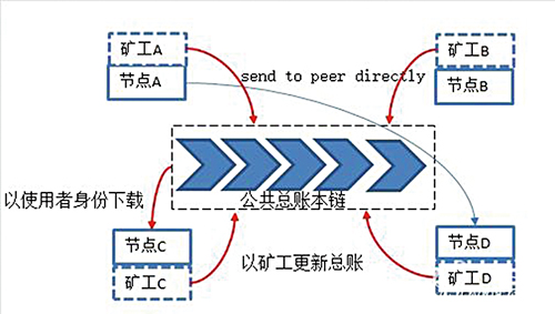 在图2点A直接发交易给节点D,所有节点一起确认并且验证交易的真实性,更新了公共总账以后,所有人再同步一下最新的总账。这里我们将维护者的身份下放至每一个参与者手中,并且通过加密算法来保证交易真实可信,这里我们不需要对账,我们只需要维护一条总账就可以。