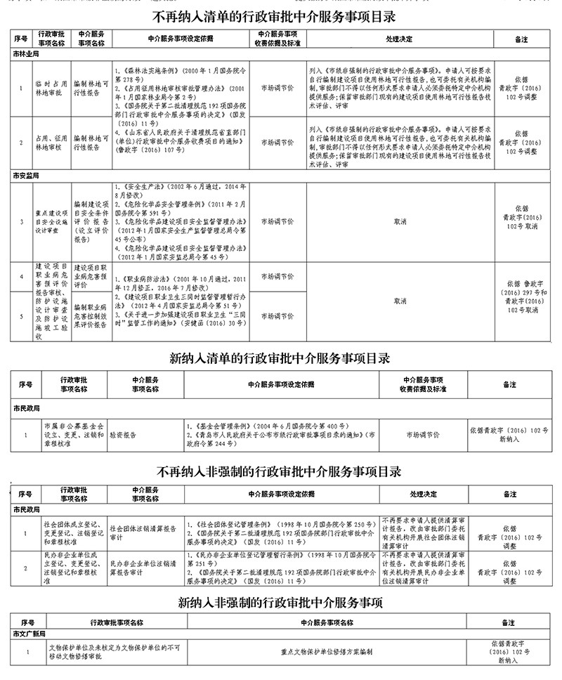 按照国务院、省政府、青岛市政府有关文件要求,根据我市行政审批事项目录调整情况,现对《莱西市人民政府关于公布莱西市市级行政审批中介服务事项清单的通知》(西政字〔2016〕15号)公布的“莱西市市级行政审批中介服务事项”和“莱西市市级非强制的行政审批中介服务事项”进行调整,其中不再纳入清单的行政审批中介服务事项5项,新纳入清单的行政审批中介服务事项1项,不再纳入非强制的行政审批中介服务事项2项,新纳入非强制的行政审批中介服务事项1项。现予以公布,自公布之日起实施。