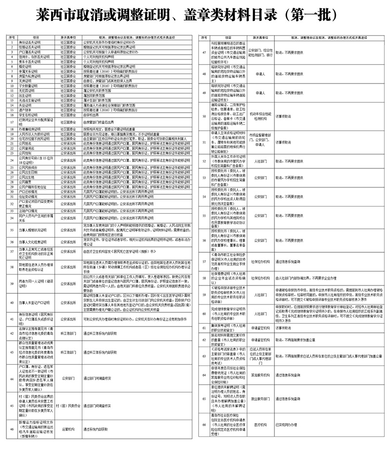 根据青岛市委办公厅、市政府办公厅《关于印发<青岛市简化优化公共服务流程方便基层群众办事创业实施方案>的通知》(青厅字〔2016〕51号)和莱西市委办公室、市政府办公室《关于印发<莱西市简化优化公共服务流程方便基层群众办事创业实施方案>的通知》(西办字〔2017〕2号)部署要求,经各有关部门(单位)梳理审议、公开征求意见、审核确认,市推进政府职能转变领导小组办公室汇总形成了《莱西市取消或调整证明、盖章类材料目录(第一批)》,现予以公布。