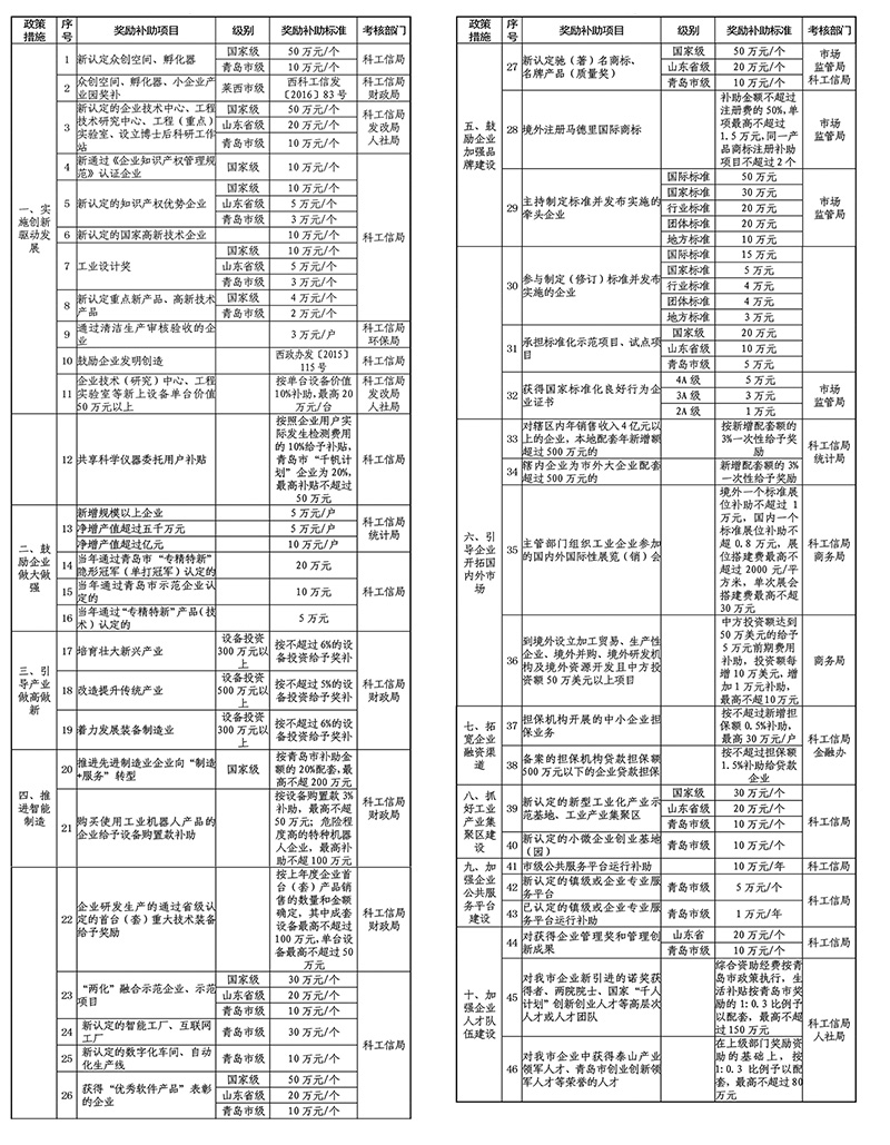 莱西市推进全市工业经济稳增长促发展奖励补助标准分类表