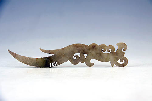 玉觽(xī),我市董家庄西汉墓出土。青白色玉质,选材考究,造型生动,雕刻细致,线条明快,神态自然有趣。玉觽是一种微曲的锥形器,最初它是随身携带。用以解结的工具,后来成为佩饰,表示成人的象征。