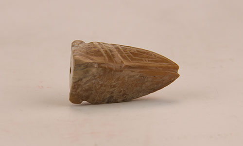 玉蝉,出土自董家庄西汉墓,高2.9厘米,宽1.2厘米,厚0.8厘米,重5.8克。选材精良,头部有一小小穿孔,属佩玉装饰,蝉身雕成直菱形,雕刻生动,形象逼真,头翼腹用粗阴线刻化,寥寥数刀即成。蝉背部双翼左右对称,如肺叶状,造型特别规整,是战国秦汉时期的精良之作。以蝉为造型的玉口含在汉代特别流行,蝉蜕皮而重生,汉人以玉蝉为葬,代表了他们希望灵魂永生的美好寄托。