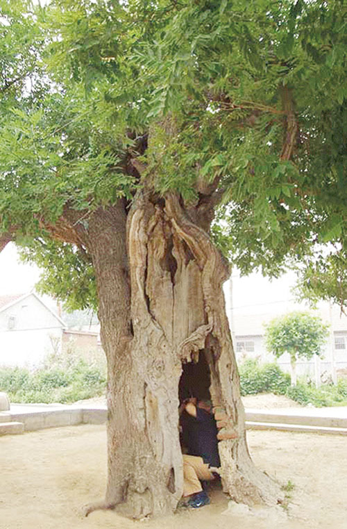 石佛院村国槐位于水集街道办事处石佛院村村委办公室前,树高11.4 米,胸围4.9 米,冠幅东西14 米、南北13.3 米,树龄710 余年,国家一级古树。