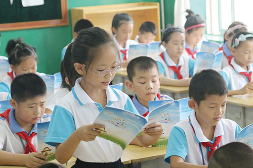 月湖小学的孩子们正在朗读《习惯修身 细节立人》校本课程。