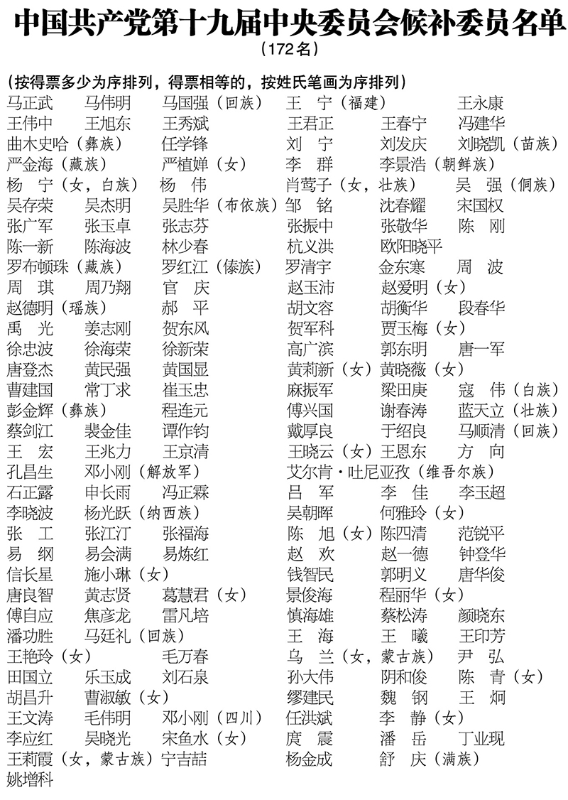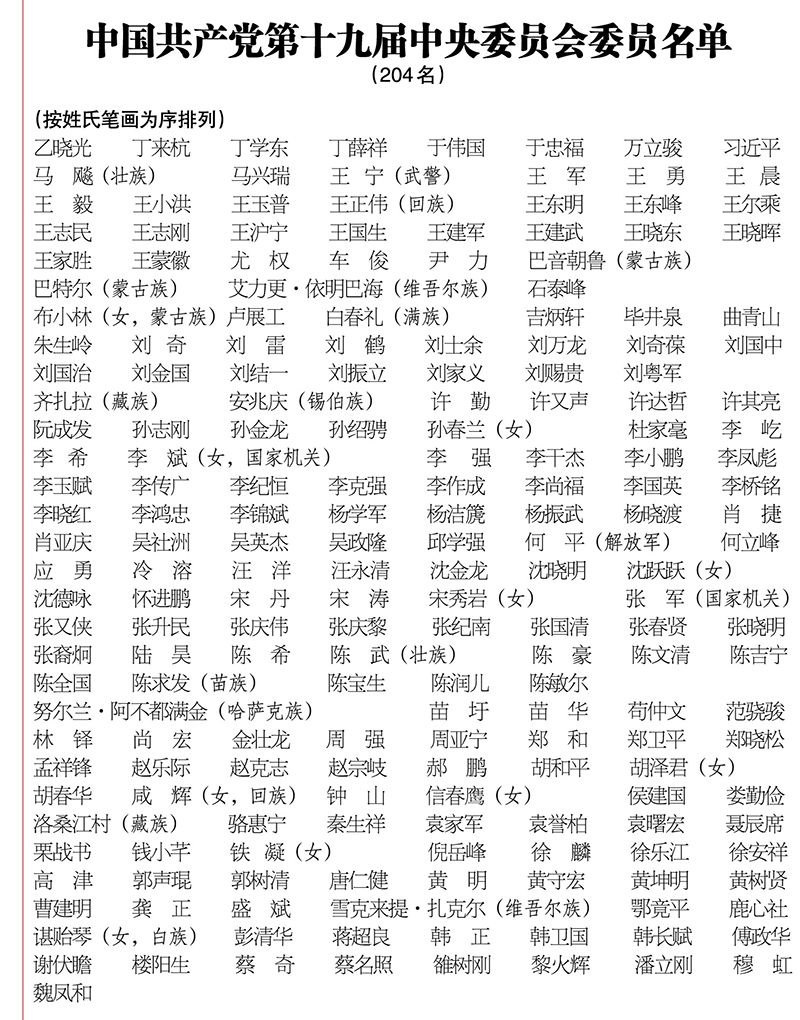 在总监票人和监票人监督下,到会的代表和特邀代表以无记名投票方式,选举出由204名委员、172名候补委员组成的十九届中央委员会,选举出十九届中央纪律检查委员会委员133名。