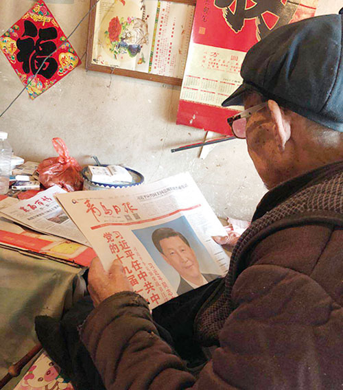 今年91岁的老人任正中家住院上镇任家院村,曾多年担任村支部书记的他非常关心国家大事。最近,党的十九大胜利闭幕,老人也没有闲着,认真读书看报,学习十九大精神。