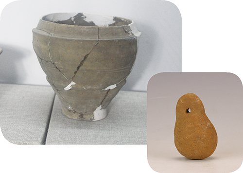 河崖遗址出土的宽沿圆底瓦纹灰陶尊和陶网坠