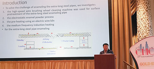 在第24届国际搪瓷大会上,青岛中邦科技发展有限公司总经理潘鹏飞,作为学术研讨会第一天唯一登台演讲的中国人发表了论文《超长搪瓷管研究》。论文中涉及到的中邦超长搪瓷管全自动喷涂线,包含了三个“世界第一”,引起了众多国际搪瓷界专家和搪瓷企业的关注。