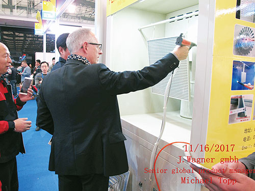 2017年11月16日,在上海涂装展上,中邦携带国际同行工人最难喷涂的工件之一——蜂窝状空调风口在展会上现场喷涂,展示喷枪的高性能,瓦格纳全球总经理手持中邦生产的喷枪反复试喷并大加赞赏。