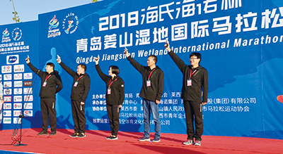 2018海氏海诺杯第三届青岛姜山湿地国际马拉松赛于10月21日在姜山湿地公园鸣枪开跑,本次比赛设置了男女全程马拉松、男女半程马拉松和迷你马拉松比赛。早晨8:00,近5000名运动员冲出起跑线,踏上赛程。