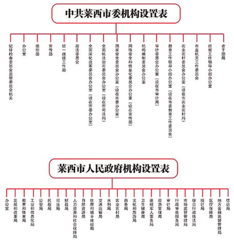 莱西市人民政府设置工作部门 2 7 个。其中,办公室挂大数据发展管理局牌子;发展和改革局挂新旧动能转换综合试验区建设办公室牌子;工业和信息化局挂科学技术局、民营经济发展局牌子;自然资源局挂林业局牌子;农业农村局挂扶贫开发办公室牌子;住房和城乡建设局挂人民防空办公室牌子;文化和旅游局挂新闻出版广电局牌子;卫生健康局挂中医药管理局牌子;行政审批服务局挂政务服务管理办公室牌子;地方金融监督管理局挂金融工作办公室牌子。