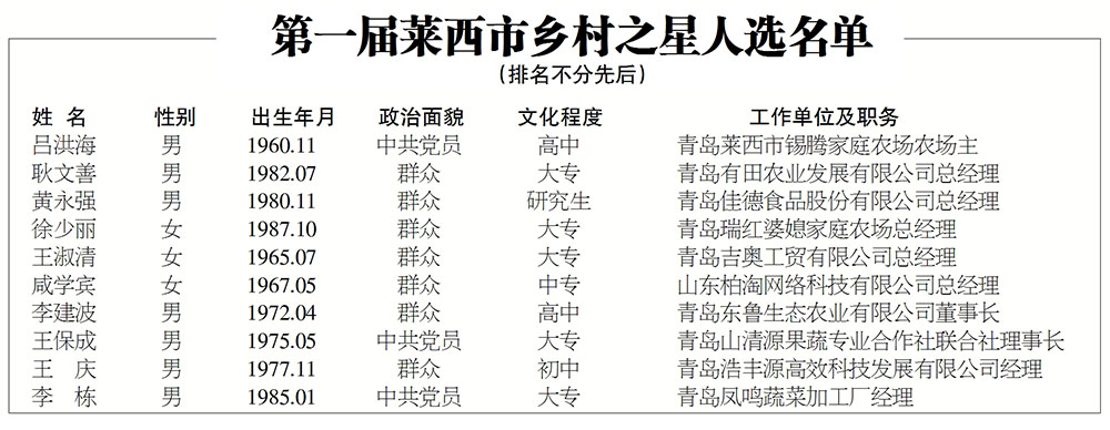 根据《关于印发莱西市乡村之星选拔管理办法的通知》规定,为进一步增强评选工作的透明度,广泛接受社会监督,现将经市人才工作领导小组研究通过的第一届莱西市乡村之星人选有关情况予以公示。