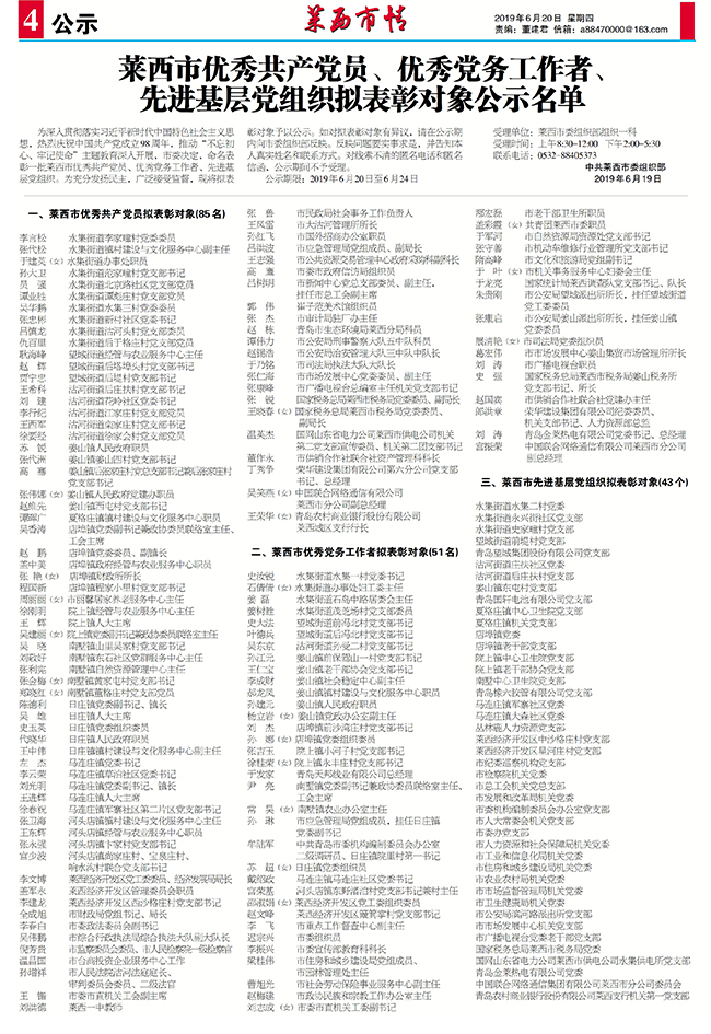 为深入贯彻落实习近平新时代中国特色社会主义思想,热烈庆祝中国共产党成立98周年,推动“不忘初心、牢记使命”主题教育深入开展,市委决定,命名表彰一批莱西市优秀共产党员、优秀党务工作者、先进基层党组织。为充分发扬民主,广泛接受监督,现将拟表彰对象予以公示。如对拟表彰对象有异议,请在公示期内向市委组织部反映。反映问题要实事求是,并告知本人真实姓名和联系方式。对线索不清的匿名电话和匿名信函,公示期间不予受理。