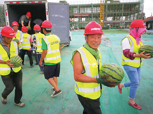 入夏以来,市总工会及时下发通知,要求全市各级工会组织结合实际,深入开展“夏送清凉”活动,督促落实《防暑降温措施管理办法》。日前,市总工会分四组走访慰问了我市部分在建重点项目高温作业的一线职工、农民工,为他们送去西瓜、矿泉水等防暑降温物品。 (徐亚晓)