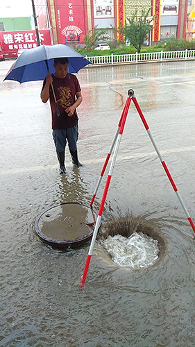 8月11日,随着降雨量持续加大,香港路部分路段出现积水情况后,市住房和城乡建设局市政处工作人员一方面积极疏通下水管道,一方面打开部分古力井盖,加大排水力度。同时设置警示三脚架,提示过往市民注意避让。