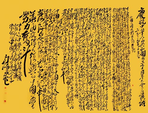 习近平《在庆祝中华人民共和国成立70周年大会上的讲话》毛体书法作品在京东大运河的燎原堂美术馆诞生。据悉,该书法作品长4米、宽3米,写在珍贵信笺纸上。在书写现场,著名书法人陈复尘等见证了这幅宏图巨作封笔。此作将在北京展出。