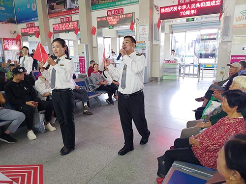 交运莱西事业部温馨巴士职工在莱西汽车站候车厅内演唱《我和我的祖国》。