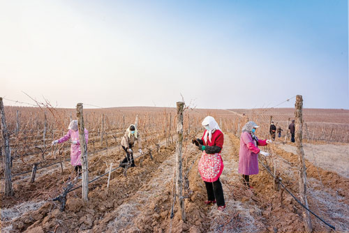 图为院上镇九顶庄园葡萄园内工人们正忙着给葡萄剪枝。