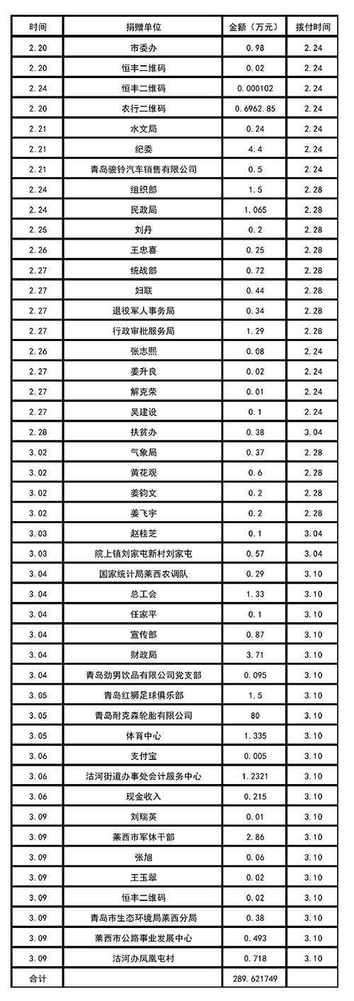 莱西市慈善总会新冠肺炎防治捐款统计台帐(拨付青岛统一汇武汉)