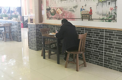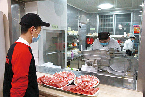 “这个桌子是‘隔离桌’,保证两桌客人间距保持在1.5米以上。”店长介绍,在进入餐厅前,食客会在服务人员引导下就坐,保证留出就餐安全距离。除了隔桌保证安全用餐距离,该店还要求每天开业前对门店进行全面消毒,餐具、毛巾进行严格清洗消毒。