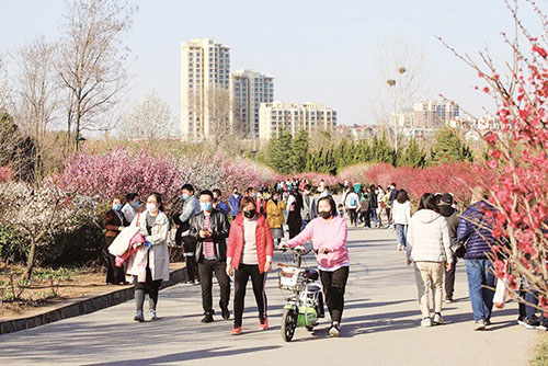 ▲梅花山公园、月湖公园内百花迎春,许多市民前来赏花拍照。